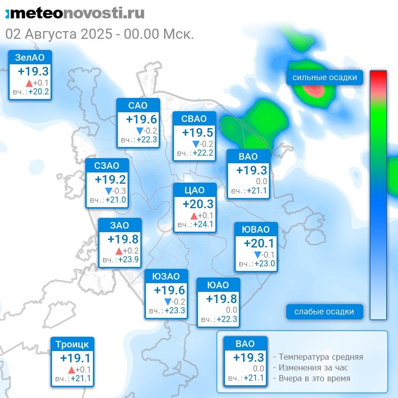 В 0:00 в Москве было от +18.8°C до +20.6°C, средняя температура +19.6°C #погода #Москва #лето #температура #2августа #суббота