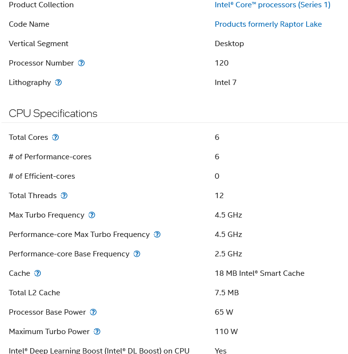 Компания Intel официально представила два "новых" процессора для настольных ПК в новой серии Core 100: Core 5 120 и Core 5 120F. Несмотря на новые названия, оба чипа практически полностью идентичны Core i5-12400 и i5-12400F, выпущенным ещё в начале 2022 года. Согласно базе данных Intel Ark, эти чипы относятся к семейству Raptor Lake и используют сокет LGA1700, совместимым с материнскими платами 12-го и 14-го поколений. Оба процессора оснащены 6 производительными ядрами, не включают эффективные ядра, а также обеспечивают 12 потоков и идентичный предшественникам объём кэш-памяти второго и третьего уровня. Единственные различия в технических характеристиках заключаются в небольшом увеличении частоты в турборежиме до 4,5 ГГц (против 4,4 ГГц) и снижении максимальной мощности в турборежиме со 117 Вт до 110 Вт. Core 5 120 оснащён встроенным графическим процессором Intel UHD Graphics 730 с чуть более высокой тактовой частотой 1,50 ГГц против 1,45 ГГц, в то время как у модели Core 5 120F, как и