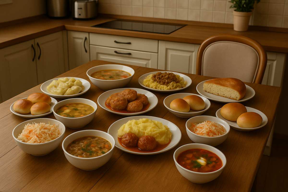 🍽 Обед: Гречневый суп с овощами + салат из капусты 🍽 Ужин: Фрикадельки в томатном соусе + картофельное пюре 🍽 Обед: Рассольник с перловкой 🍽 Ужин: Запеканка из макарон с фаршем + свежие помидоры 🍽 Обед: Лёгкий овощной суп с вермишелью 🍽 Ужин: Курица на сковороде с кабачками + рис 🍽 Обед: Борщ со сметаной 🍽 Ужин: Рыбные котлеты + гречка + салат "Витаминка" (капуста + морковь) 🍽 Обед: Суп с фрикадельками (остатки) 🍽 Ужин: Домашняя пицца на батоне + огурчики 🍽 Обед: Окрошка на кефире 🍽 Ужин: Ленивые голубцы 🍽 Обед: Рис с овощами и курицей (ленивый плов) 🍽 Ужин: Творожная запеканка + какао или чай — Булочки с повидлом — Пирог с капустой — Капуста + морковь + масло — Огурец + помидор + сметана — Битые огурцы с чесноком Овощи: картофель, капуста, морковь, лук, кабачки, свёкла Мясо: курица, фарш, немного рыбы Крупы: гречка, рис, вермишель, перловка Молочка: кефир, сметана, творог, сыр