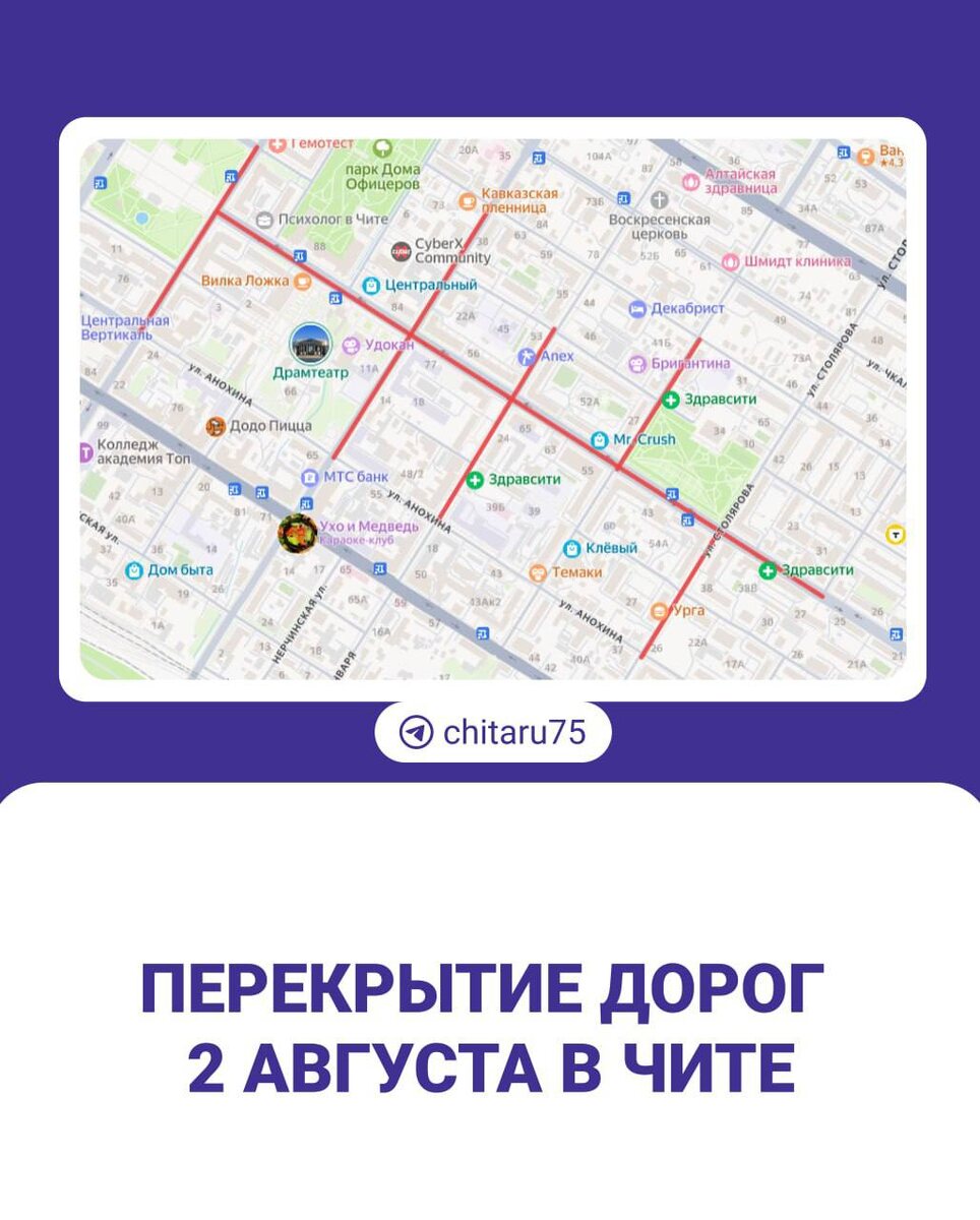 В городе перекрыты дороги для праздничного забега в честь Дня железнодорожника. Благотворительный забег «Достигая цели!» проведут, чтобы собрать деньги на лечение и реабилитацию детей. Он стартует на площади Ленина в 10:00. С 8:00 до 12:00 перекроют следующие улицы: 🟦Ленина от Ленинградской до Красноярской; 🟦Ленинградскую от Чайковского до Анохина; 🟦Полины Осипенко от Забайкальского рабочего до Анохина; 🟦9-е Января от Ангарской до Анохина; 🟦Островского от Забайкальского рабочего до Ленина; 🟦Столярова от Ленина до Анохина. Маршрутки тоже поменяют схему проезда.⬇️
