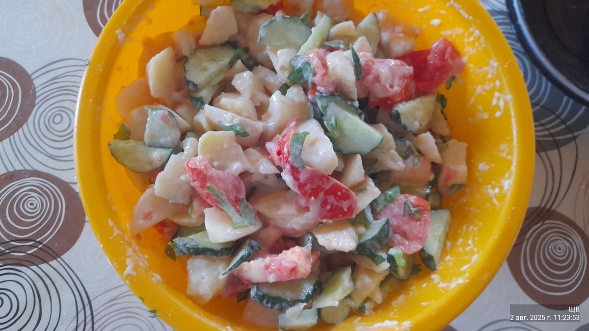Домой пришла,время 11 часов. Кинулась завтрак готовить. Картоху в мундирах сварила, пока над сыром колдовала. А картоху я очень люблю такую, как у бабушки в детстве ели. Свежую,еще теплую, она чистила и резала. В картошку помидоры,огурцы, зелень кое какую. Посолить и залить сметаной... (ну, или в нашем случае сливками. Как же вкусно... И быстро. И сытно.