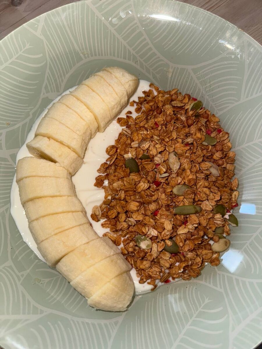-греческий йогурт -гранола -банан (любой фрукт, ягода) -ваш любимый чай (у меня - земляничный улун) -любимое протеиновое печенье / батончик (хотя, честно, в меня уже не лезло, так как йогурт +банан+гранола - это очень сытно!😍) Насыщает на ~4-5 часов, без добавления белого сахара, целых 40г белка (вау!!!) , вкусно ! Когда я понимаю, что впереди плодотворный и активный день, я делаю себе именно такой завтрак! Попробуйте С любовью, Диляра Больше меня в тг:@welcome,девочки💋 #пп #завтрак #идеи #похудение