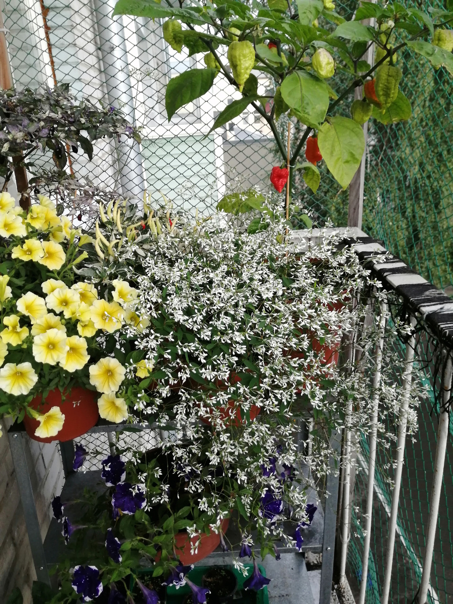 Нынче о балконе почти ничего и не писала, как-то не до того было. А между тем у меня слегка сменился подход. Я больше не хочу ярких красок и буйства петуний и петхоа. Зато попробовала пару, нет, даже три новых растения и могу поделиться впечталениями. Номер раз - молочай злаковый. Могу сказать, что вначале он меня разочаровал. Цветение было хиленьким, бодылья длинными, и любой ветерок и даже мое не сильно палящее балконное солнце превращали его в нечто варено-неудобоваримое. После очередного ветреного дня, психанув, я обкорнала его чуть не налысо. Но я сменила парадигму не только в плане набора растений, но и в плане ухода. Нынче неукоснительно кормлю балконных товарищей раз в неделю. И это дало плоды. Молочай на итого раздухарился, стал похож на белое облачко и пребывает в таком виде постоянно. Да, горшок небольшой - три литра. Мне кажется, ему больше и не надо. При условии подкормок вполне нормально. Место ему досталось козырное - на верхней полке стеллажа, и он слегка ампелится. Д
