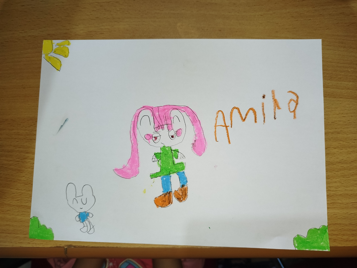 Вчера преподаватель изобразительного искусства дал Амире задание нарисовать то, что присутствует вокруг и то, что она видела в реальности, потому что она опять начала рисовать с зайчиков Краски мы ещё не купили - деньги придут в понедельник, поэтому рисовала Амира пастелью. Такое они рисовали в школе - сначала разными цветами закрашивается участок, потом чëрным, а затем тонким предметом делаются линии Дальше она нарисовала вид из окна и стол Также преподаватель сказал писать название каждого рисунка. Амира нарисовала очередной портрет Художник сказал его раскрасить Ещё Амира нарисовала кусок золота и несколько бриллиантов, учитель начал объяснять ей градацию цвета, оттенки на разных участках предметов Также Амира изобразила коллекцию солнцезащитных очков разной формы и цвета Попробовала нарисовать чашку, но так как народу уже набежало слишком много, Амира пошла за маленький стол, а он покрыт мозаичным рисунком, поэтому линии получились не совсем ровные В следующий раз подложим карт