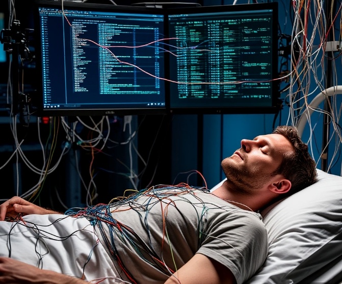 Человек лежал на функциональной кровати в паутине проводов, тянущихся от датчиков, закреплённых на руках, теле и — больше всего — на голове. Они соединяли его с огромным плоским монитором, висевшим над изголовьем, через пульт управления напоминающим консоль контроля за полетами в центре НАСА.
