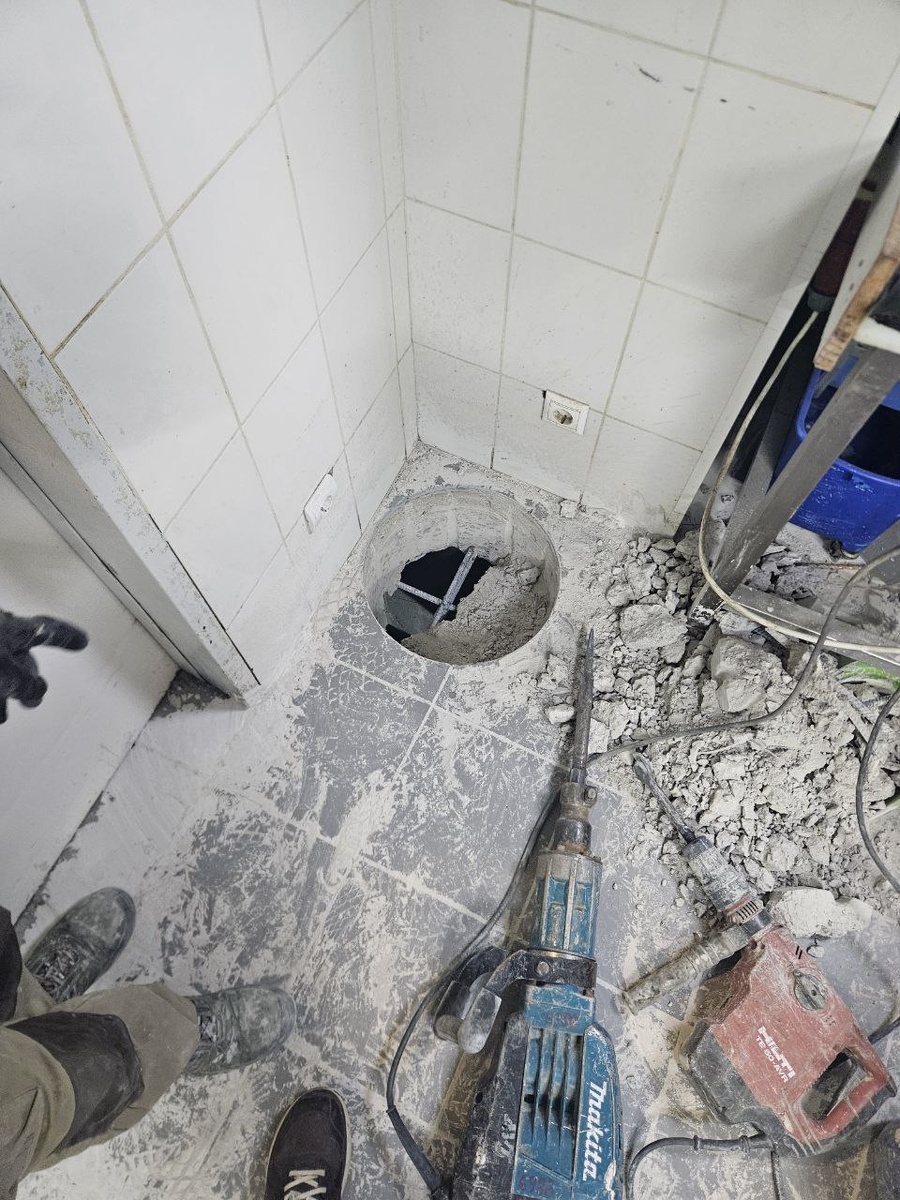 Бурение отверстий Ф400 с разбивкой бетона и без полного добуривания. Последние 2см отбиваем вручную, чтобы не допустить падения бетона