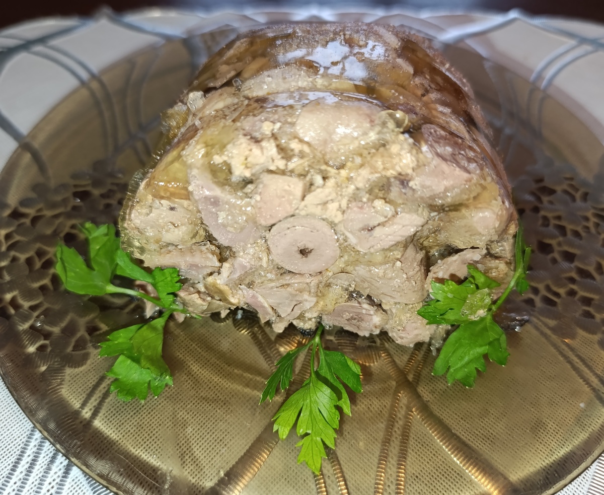 Ингредиенты: куриные сердечки 300 гр куриные желудочки 300 гр куриная печень 300 гр куриная грудка 200 гр желатин 5 ч л соль, специи любые по Вашему вкусу Куриные сердечки, желудочки, печень и грудку моем и отвариваем в соленой воде около 1,5 часов. Далее сливаем воду, остужаем и нарезаем любым удобным для Вас способом (у меня крупновато для такого блюда, но это наши предпочтения. А так можно даже разобрать по волокнам - это дело Ваших индивидуальных предпочтений). Отрезаем от пластиковой бутылки верхушку и вперемешку выкладываем нарезанные потрошка. У меня двухлитровая бутылка была заполнена на две трети. На данное количество плотно уложенных потрошков нужно не больше 1 стакана жидкости. В стакан с горячей водой добавляем желатин, соль (около 0,25 ч л0 и любые Ваши любимые специи - у меня: 0,25 ч л черного молотого перца и 1 ч л гранулированного чеснока. Смесь я перемешиваю в стакане вилкой, так как так хорошо видно, кода желатин разбухает и растворяется. Я его всегда запариваю, не ва