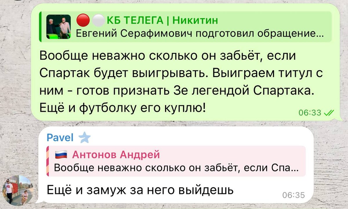 Ещё раз к вопросу о нужности и полезности пенсионера Заболотного для Спартака. Я уже говорил, повторю ещё раз. Я болельщик Спартака! Не Лукойла, хотя заправки у них лучшие в стране, не персонально Барко, Угальде, Жедсона, Денисова, Литвинова или даже Заболотного. Главное желание нормального болельщика - победы любимого клуба. Если при этом будет показана красивая игра - хорошо. Если это сделают свои воспитанник - вообще отлично. Поэтому лично мне абсолютно наплевать кто там бегает на поле в футболке Спартака, если они приносят клубу победы и титулы. Если это будет 34-летний Заболотный, над которым многие смеются, то так тому и быть. Если Спартак с Заболотным в этом сезоне выиграет титул, то я с чистой совестью готов признать его легендой клуба и на следующий же день пойду и куплю футболку с его фамилией на спине. Мне правда в одном из чатиков предлагают ещё и замуж за него выйти после таких слов, но у меня есть что ответить.