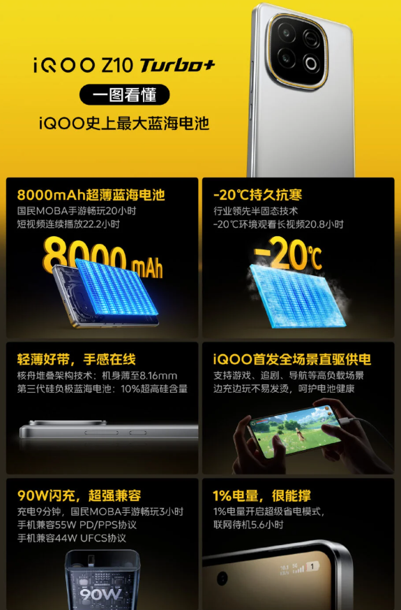 iQOO Z10 Turbo+ должен дебютировать в Китае 7 августа. В преддверии запуска бренд выпустил новый рекламный постер, демонстрирующий все ключевые характеристики модели Z10 Turbo+. Согласно тизеру бренда, iQOO Z10 Turbo+ будет представлен с аккумулятором ёмкостью 8000 мА·ч, который удалось поместить в тонкий корпус толщиной 8,16 мм. Это самый большой аккумулятор за всю историю бренда, и дело не только в размере. Компания заявляет, что аккумулятор способен обеспечить до 20 часов игры в MOBA или 22,2 часа просмотра видео. iQOO заявляет, что телефон может работать в течение 20,8 часа в режиме воспроизведения видео при температуре -20°C, что стало возможным благодаря полутвердотельному аккумулятору. Эта технология может повысить надёжность работы в холодную погоду, что является типичной проблемой для традиционных литий-ионных аккумуляторов. Смартфон также поддерживает протоколы PD/PPS мощностью 55 Вт и UFCS мощностью 44 Вт, что позволяет зарядному устройству из комплекта работать с различными
