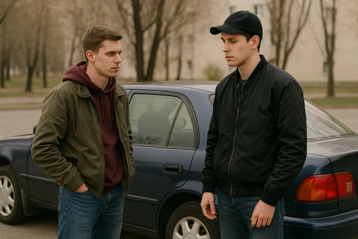 У подъезда стояла старая, тёмно-синяя «Тойота». В салоне уже сидели ребята — Макс, Дэн, и какой-то незнакомый парень в тёмной куртке. Евгений подошёл ближе, заглянул в окно.