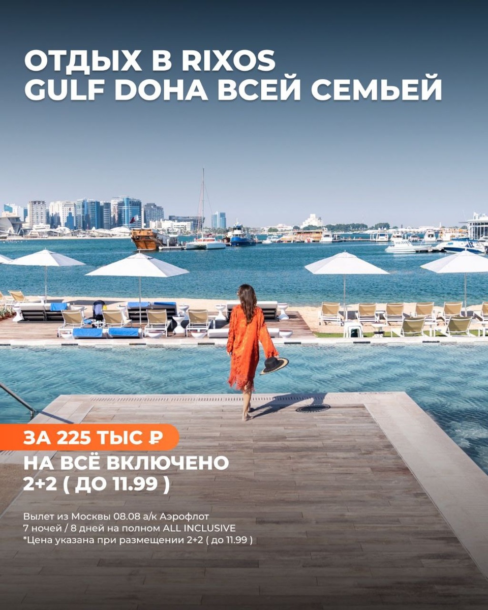 🇶🇦 Rixos Gulf Doha: Роскошный отдых ВСЕЙ СЕМЬЕЙ по суперцене! 🔥 Мечтаете о незабываемом отпуске в Катаре? 🌴 О белоснежных пляжах, лазурном море и высочайшем уровне сервиса? Тогда это предложение для вас! Представьте: 🪄 Вы нежитесь на собственном песчаном пляже, пока ваши дети весело плещутся в бассейне! 🏖️ 🪄 Вы расслабляетесь в шикарном спа-центре, а ваши дети весело проводят время в детском клубе! 🧸 🪄 Вы наслаждаетесь изысканными блюдами мировой кухни, а ваши дети с удовольствием выбирают свои любимые лакомства из детского меню! 🍽️ 🪄 Вы открываете для себя захватывающий мир Дохи, а ваши дети с восторгом изучают достопримечательности и развлечения! 🏙️ Rixos Gulf Hotel Doha 5* – это: • Стильные номера с видом на море! 🌊 • Собственный песчаный пляж! ☀️ • Бассейны для взрослых и детей! 💦 • Роскошный спа-центр! 💆♀️ • Рестораны с кухнями всего мира! 🌍 • Развлечения на любой вкус! 🎉 • Удобное расположение рядом с достопримечательностями и аэропортом! ✈️ Не