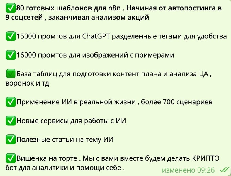 Ты либо используешь ИИ, чтобы стать эффективнее x10. Либо потом будешь работать на тех, кто использует. ИИ уже меняет профессии, бизнесы и даже рынки. Поэтому я открываю модуль для клуба с ИИ базой , которая будет самой большой на СНГ рынке ( просто посмотри на 1 фото что уже удалось собрать ) ⚡️ Я собрал канал с огромной базой знаний по ИИ — от А до Я. Без воды. Без рекламы. Только выжимка: ➕ИИ для криптовалют ( создаем своего ИИ агента который будет вам помогать ) ➕Лучшие ИИ-инструменты с описанием и кейсами; ➕Чёткие инструкции — что, зачем и как применять; ➕Лайфхаки, которые экономят часы работы каждый день. 🎯 Подходит всем: маркетологам, предпринимателям, студентам, продактам и просто любопытным. 🌟 Ты не обязан разбираться в ИИ ‼ Для участников клуба , готовы принять 200 человек ( пока 140 ) . ‼️На следующей неделе будем все месте в прямом эфире создавать AI криптобота Хватит быть просто зрителем — становитесь участником ИИ-прогресса! Так же я создал отдельный канал ку