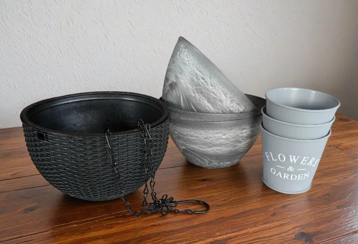 Ну, друзья, это прямо таки нечто)) Заказала я пять подвесных двойных горшков. Вы знаете, я не люблю поддоны, поэтому в основном покупаю либо двойные горшки, либо кашпо без отверстий. Так вот, все пять были одинаковыми по внешнему виду и предельно дешево стоили. Два поменьше и три побольше. Два поменьше едут от одного продавца, а три побольше от другого. Так вот эти три горшка разбили на отдельные доставки и привозят по одному))) Доехал до меня первый. Это черный типа корзинки на фото. Удобно, что двойной и что его можно как ставить, так и вешать по желанию.