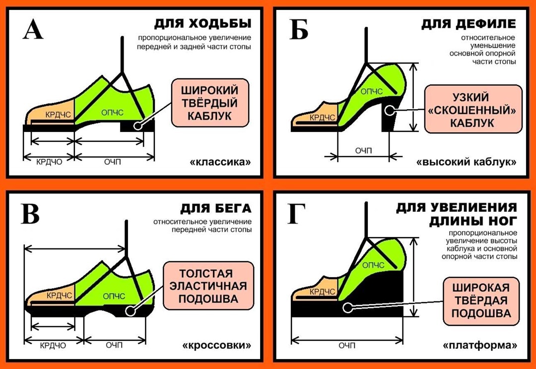 Обувь типа кед, балетки, туфли пр. с плоской подошвой и такой же стелькой «убивают» стопу. А при длительном ношении способствуют образованию маршевых переломов стоп.
