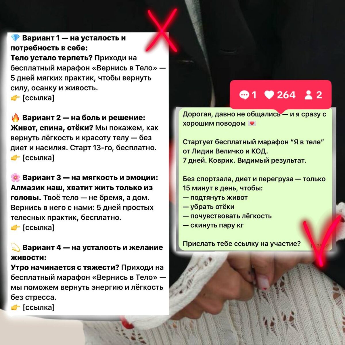 Как написать сообщение в директ, чтобы его открыли и человек ушёл в твою CRM Если ты пишешь в Instagram*: «Привет! У нас стартует бесплатный марафон, вот ссылка — приходи» будь готов, что тебя не откроют, не прочитают и, возможно, кинут в спам 🙃 Ноль контекста. Ноль безопасности. Полный «ой, опять мне что-то впаривают». Теперь посмотри на картинку с зеленым фоном. Там совсем другое ощущение 💘 Как будто тебе написала знакомая. Без суеты. Без призывов. Как сделать такое сообщение? 1️⃣Сначала — тёплое, спокойное сообщение. Словно пишет одноклассница или бывший или таксист где ты забыл очки. 2️⃣Потом — напоминание, кто пишет и откуда вас знают. Используй имена основателя или яркие ассоциации с брендом. 3️⃣Только потом рассказываем что предлагаем и пусть то будет что-то бесплатное (умоляю, не за деньги и не тупой переход на тг) 4️⃣И только если человек сам отвечает «да» — ему отправляют ссылку. Это и есть продающее сообщение в директ. 📌 Инстаграм видит диалог, а не спам 📌 Человек чу