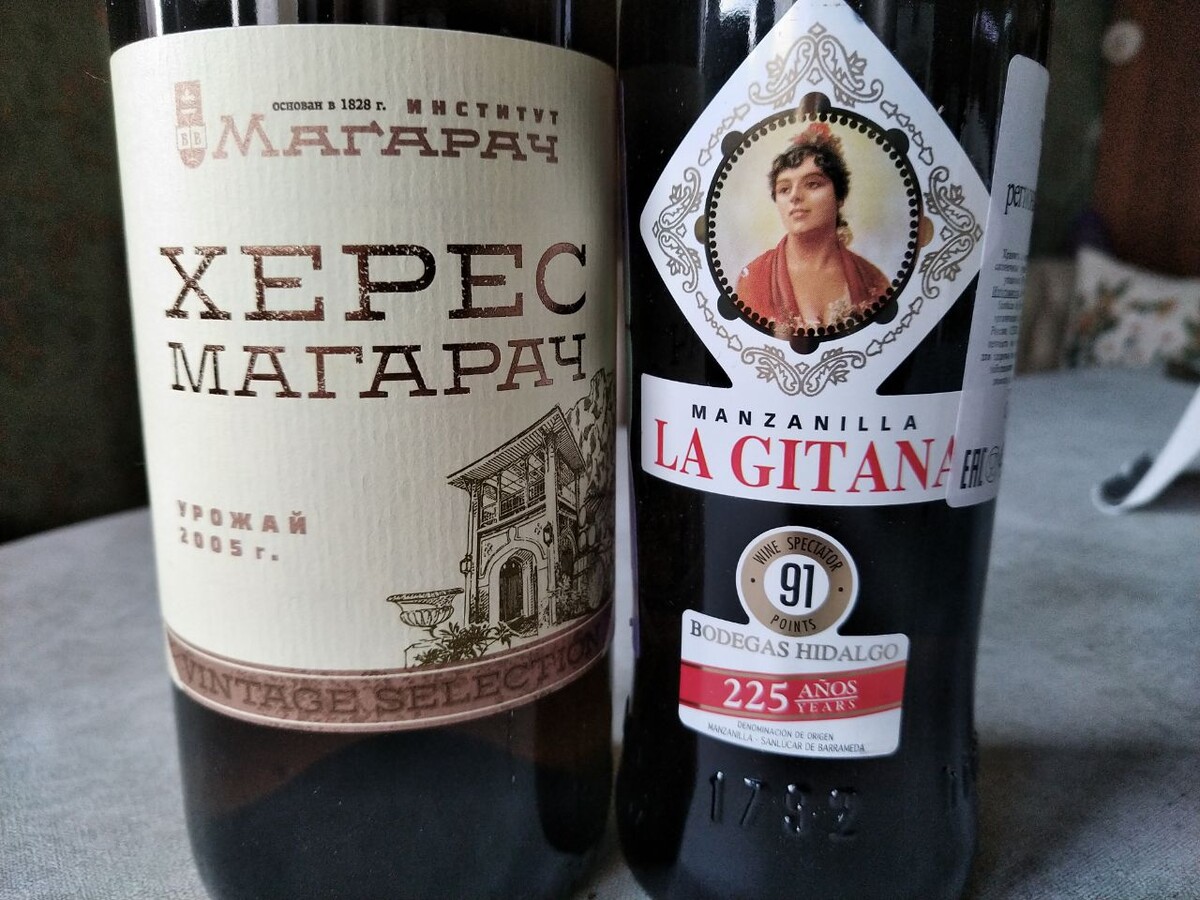 Сегодня в сравнении два сухих хереса большой выдержки. "Херес Магарач Сухой" изготовлен из алиготе и совиньона зелёного, не слишком часто появляющегося в винах в меня на обзорах, сорта. Год урожая 2005-й, розлив был в ноябре-2024. То есть, лет 19 в бочках. Купил в Алуште, в Винторге на Перекопской, там было дешевле всего по городу, за 2570 руб. Manzanilla la Gitana от винодельни Hidalgo традиционно для испанского сухого хереса изготовлен из паломино фино. Год урожая традиционно не указан. Розлив июль-2021. Купил в "Крю ПРфи" в Москве по цене1100 рублей за бутылку объёмом 0,375 л. Сейчас, кажется, дороже. Цена, получается, почти одинаковая. Начнём. Цвет у напитков вполне сопоставимый. Херес Магарач Аромат сухофруктов с выделяющимися нотами прелых яблок. Изюм, желтая курага. Ржаная корочка. Сырые молочные орехи... хотя не знаю. Вкус с кислинкой, продолжает аромат. Кислинка, надо отметить, сухофруктовая. Всё это мягко, ненавязчиво, без спиртуозности в ощущениях. Послевкусие долгое. Впеч