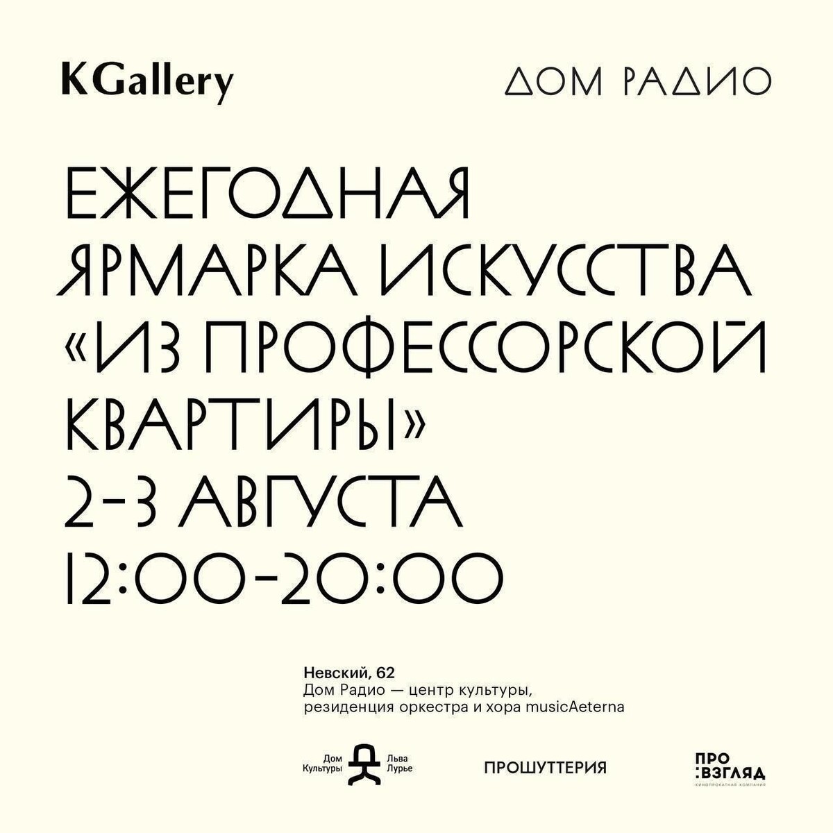 В Доме радио в Петербурге 2 и 3 августа пройдет ярмарка искусства «Из профессорской квартиры». На ней представят более тысячи графических работ художников XX века. Ярмарка разделена на два зала. В основном помещении представлена большая часть графических работ. В других залах размещены три выставочных проекта, каждый из которых посвящен творчеству одного художника. Параллельная программа обещает быть насыщенной. Кинокомпания «Про:взгляд» покажет драму немецкого режиссера Маттиаса Гласнера «Жизнь». Фильм рассказывает о семье, где каждый член переживает экзистенциальный кризис. Музыка будет звучать в Доме радио оба дня. 2 августа состоится концерт электронной экспериментальной музыки от Егора Ананко и Виктории Харкевич, известных как проект kraaa. На закрытии ярмарки выступит квартет солистов musicAeterna, исполняющий произведения А. Глазунова и М. Никодиевича. На ярмарке гостей ждет насыщенная программа от Дома культуры Льва Лурье. Вадим Высоцкий объяснит, почему Петербург можно назвать