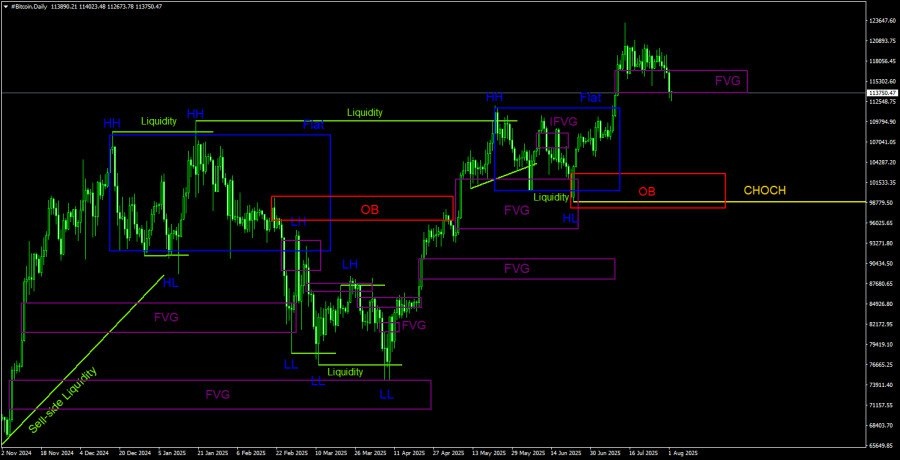 Биткоин наконец-то начал показывать признаки хоть какой-то коррекции. Дневной «бычий» FVG старался всеми силами удержать цену выше себя, но пятничная статистика по рынку труда США помогла преодолеть этот паттерн. Таким образом, впервые за долгое время речь идет о коррекции, а не о безоткатном росте, основанном на голом энтузиазме инвесторов. Напомним, что глобально крупные игроки продолжают игнорировать любой макроэкономический и фундаментальный фон. Даже в пятницу, когда весь криптовалютный рынок опустился, по сути, мы должны были увидеть рост. Так как рынок труда США сжимается под давлением «супер-выгодной» политики Дональда Трампа, ФРС практически гарантированно снизит ключевую ставку в сентябре. Вероятно, это случилось бы уже в июле, но данные по рынку труда были опубликованы через два дня после заседания ФРС.
