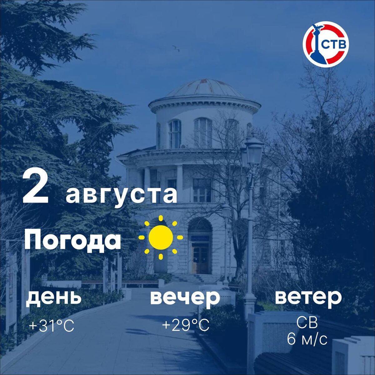 ☀️ Доброе субботнее утро, севастопольцы! День будет жарким — самое время для водных процедур. Температура воды в море около +27°. Отличного настроения! 📺 Подписывайтесь на СТВ