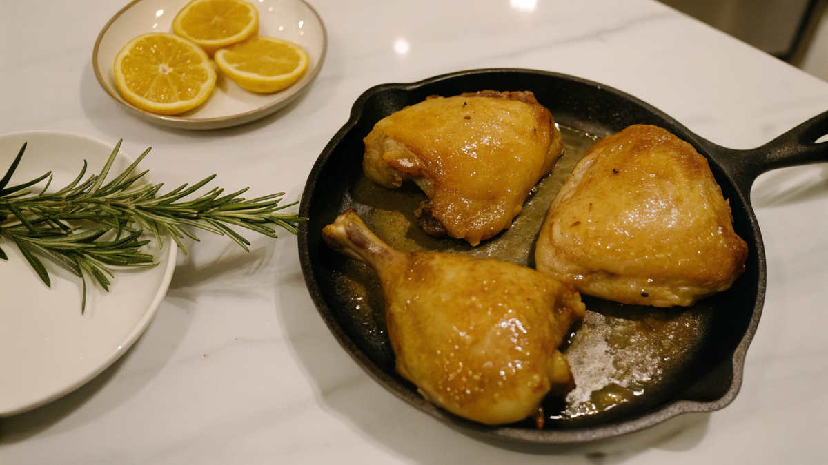 Разогрейте масло на сковороде. Выложите бёдрышки кожей вниз. Жарьте 7 минут на среднем огне до хрустящей корочки.