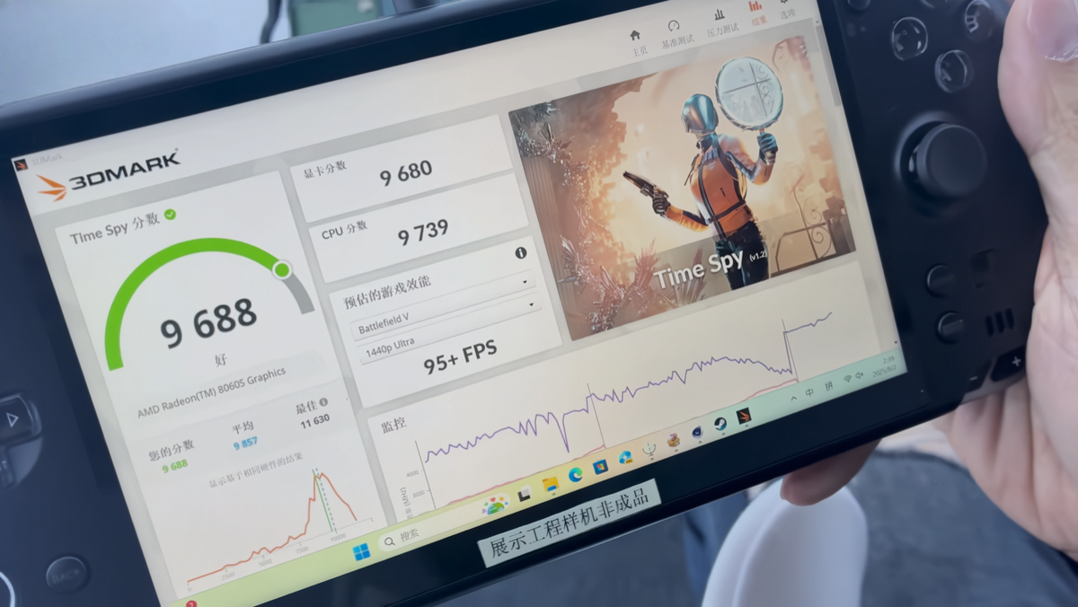 GPD готовится выпустить портативную игровую систему Win 5. Это устройство станет первым в мире handheld-ПК с топовым APU AMD Ryzen AI MAX+ 395 Strix Halo. Новинка обещает графическую производительность на уровне видеокарты Nvidia RTX 4060. Тест 3DMark Time Spy Флагманский процессор AMD для Win 5 построен на архитектуре Zen 5. Он содержит 16 ядер и 32 потока. Интегрированная графика Radeon 8060S демонстрирует впечатляющие результаты в тестах. В 3DMark Time Spy графическое ядро набирает около 9680 баллов. Это всего на 15% меньше результата RTX 4060, который показывает 11 413 баллов. Производительность APU остаётся высокой даже при ограничении TDP 70 Вт. В тесте CPU-Z процессор демонстрирует 771 балл в одноядерном режиме. Многоядерный результат достигает 12 678 баллов. В Cinebench R23 чип показывает 30 495 баллов. В играх система обеспечивает комфортный геймплей. К примеру, в Black Myth: Wukong устройство выдаёт стабильные 80+ FPS на ультра-настройках в разрешении 1920 × 1080 пикселей. Иг