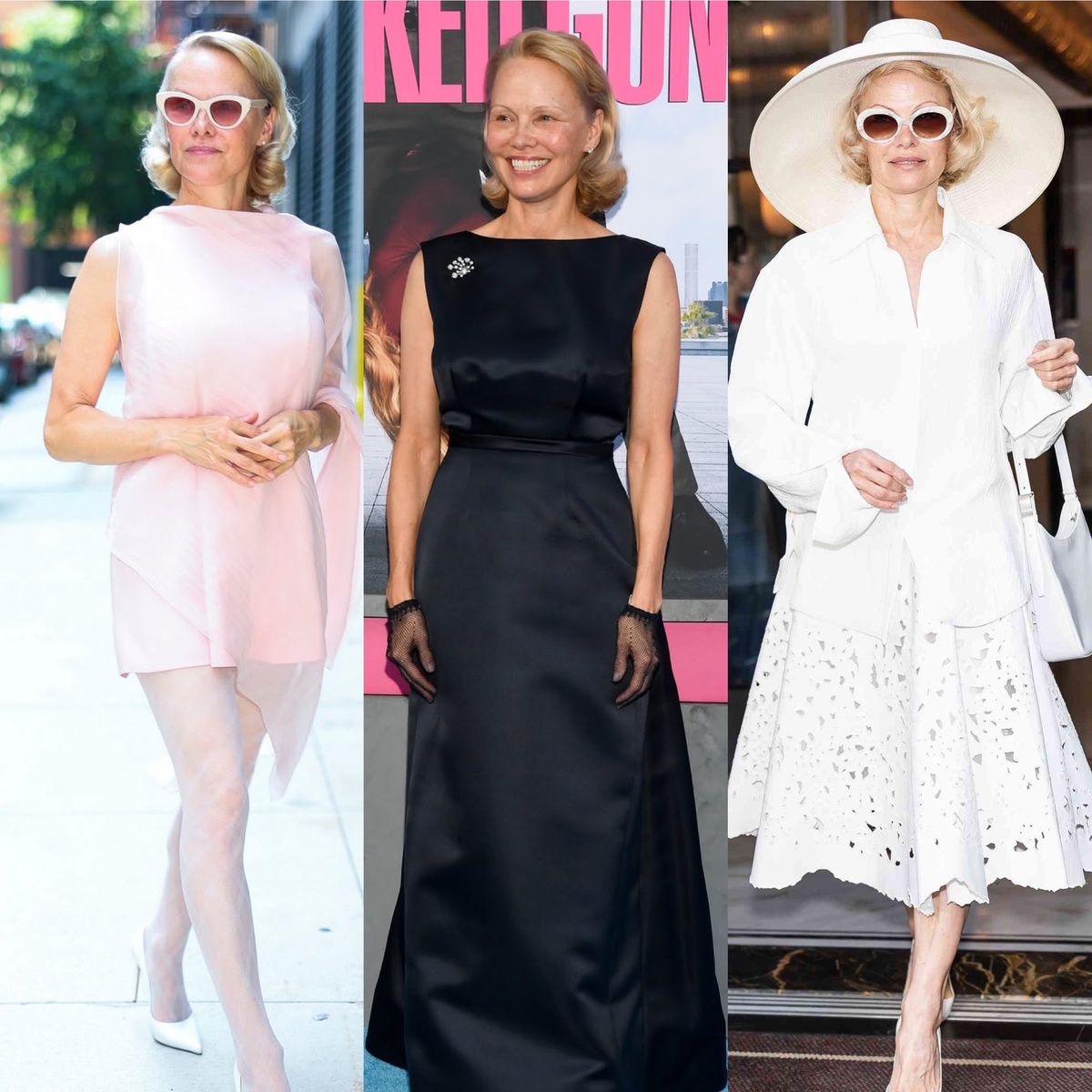 Последние выходы Памелы Андерсон — это не просто промо-тур, а модный манифест зрелой красоты. Без яркого макияжа, без сложных укладок, без стремления выглядеть моложе. На смену прежней «спасательнице Малибу» пришла женщина, которая говорит языком стиля — и говорит громко. Элегантно, изящно, уверенно. Памела демонстрирует, что после пятидесяти начинается не спад, а собственная мода: с тонкими тканями, правильными силуэтами и светом, который идёт изнутри. Образ 1 - жёлтое платье с кружевом и сияющее пальто На улицах Нью-Йорка Памела появилась в светло-жёлтом платье Gucci с кружевной отделкой и высоким воротом. Поверх — блестящее пальто из той же коллекции. Образ завершает миниатюрная белая сумка с бамбуковой ручкой — из культовой линии Bamboo от Gucci. Это редкий случай, когда total look от одного бренда работает не как демонстрация лейбла, а как поэтический нарратив. Образ 2 — пастельно-розовое мини и белые аксессуары Шифоновое платье в нежном розовом оттенке смотрится не инфантильно