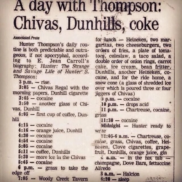 Хантер Томпсон самый безумный писатель, создатель «Страха и отвращения в Лас-Вегасе» и стиля «Гонзо» в журналистике, в 1995 году опубликовал в одной из местных газет свой распорядок дня. Читатели, даже из числа тех кто знал Томпсона были мягко говоря удивлены (хотя здесь применимо другое выражение). На протяжении долгих лет писатель придерживался такого графика: Подъем 3 часа дня