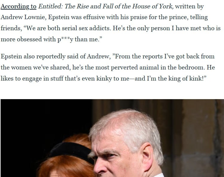 Epstein says 'only Prince Andrew more pussy obsessed than me' — new book Entitled quoted by Daily Beast Why are 'royals' 'the most perverted'?