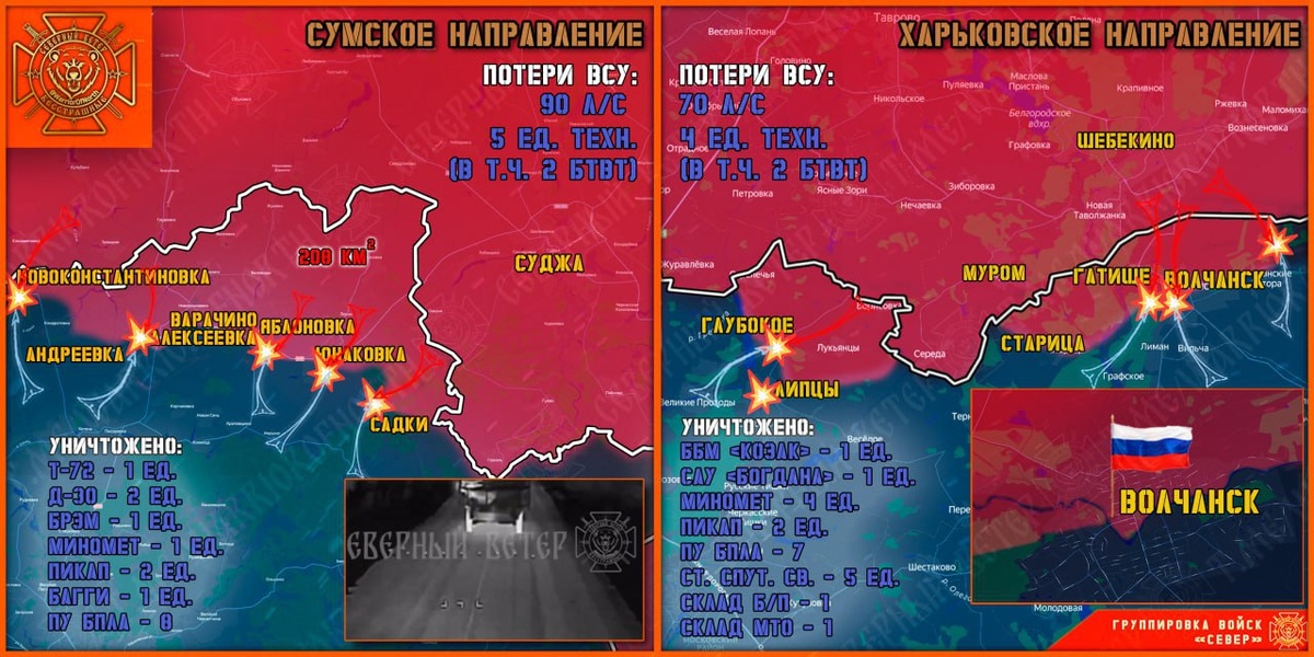 Возле курской границы ВСУ наращивают число подразделений БПЛА По информации сводки на утро 2 августа от телеграм-канала «Северный Ветер», на границе Курской области стоит затишье, ВСУ не предпринимали попыток контратаковать. На Теткинском и Глушковском направлениях неприятель наращивает количество подразделений БПЛА. Разведка бойцов «Севера» вскрыла три боевые группы ВСУ в районе Рыжевки и уничтожила их. Группы передвигались на пикапах. Военные РФ продолжают оттеснять ВСУ от границы и создавать полосу безопасности в Харьковской и Сумской областях. Недалеко от курского участка фронта, на Сумском направлении в районе Юнаковки и Новоконстантиновки штурмовики РФ с тяжелыми боями продвигаются вглубь сел и закрепляются. Украинские формирования контратакуют фланговыми ударами: на участке фронта Новоконстантиновка-Варачино-Яблоновка за сутки противник провел пять контратак На Харьковском направлении командование ВСУ перебросило элитную бригаду теробороны. Российские войска освободили истор