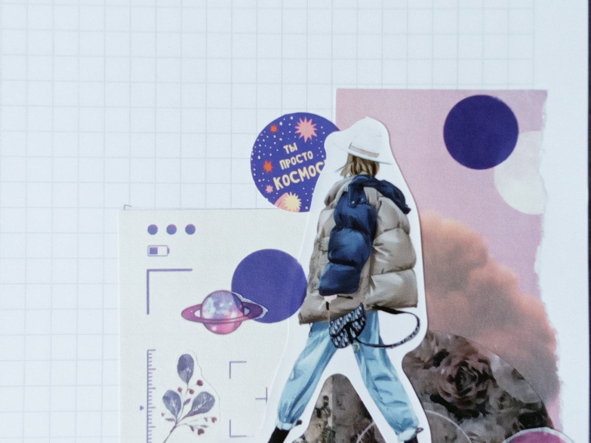 Всем чернично-космический привет! Ох, как давно планировала сделать следующую подборку оформлений из моего личного дневника, но все никак не могла засесть за неё. Коллажи делать продолжаю, а вот подготовить статью оказалось затруднительно: то нет времени, то нет настроения. А мне хочется продолжить цикл публикаций с коллажами, вдруг вы найдёте в них вдохновение для своего творчества. В прошлый раз я выкладывала пять оформленных разворотов. Сегодня прикрепляю семь, два из которых вы уже могли видеть. Итак, далее в блокноте появились небольшие коллажики с кошками в интерьере. Ну с животинками же так уютно становится дома, ведь правда? Добавила кошачьего уюта и на странички. Сделала это оформление просто из нескольких тематических наклеек. Некоторые стикеры трудно представить где можно использовать. Как, например, телевизор. Может они предназначаются только для ежедневника. Для фона вклеила скрап-бумагу с изображением картин. И наклейки с котиками из разных наборов. Дальше созда