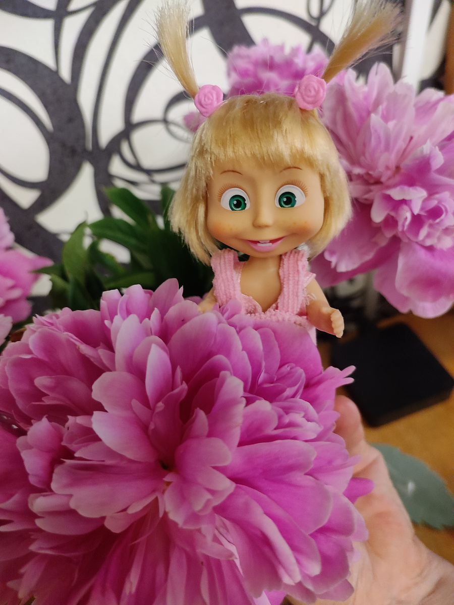 Моя прекрасная Машутка, Передает тебе привет! Она чудесная малютка, Вот улыбается в ответ. Озорничает и смеётся, В пионы снова забралась. Ну как же тут не улыбнуться И на руки её не взять?
