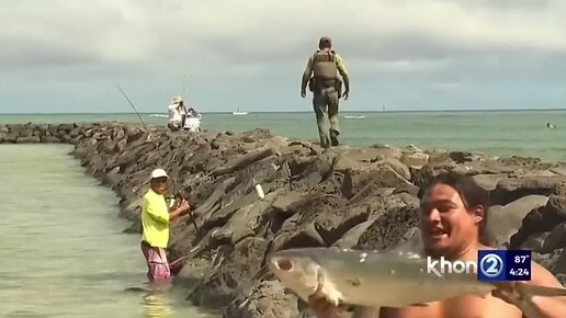 На Гавайях рыбак задорно похвастался уловом в прямом эфире местного Khon-TV во время сюжета о грядущем цунами, вызванным землетрясением на Камчатке