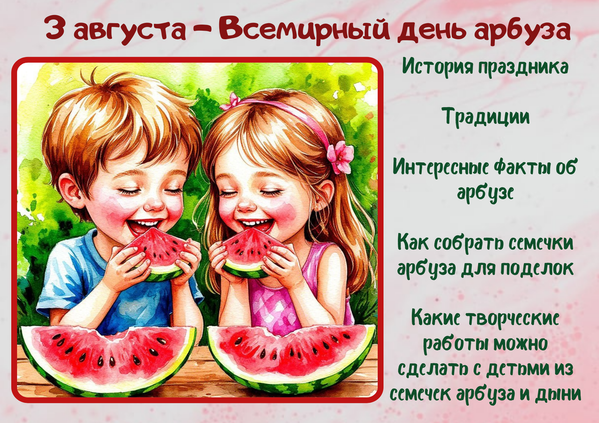 Всех с праздником! Обязательно в этот день расскажите детям интересные факты об арбузах, купите и полакомитесь сочной мякотью, а семечки не забудьте собрать для поделок!