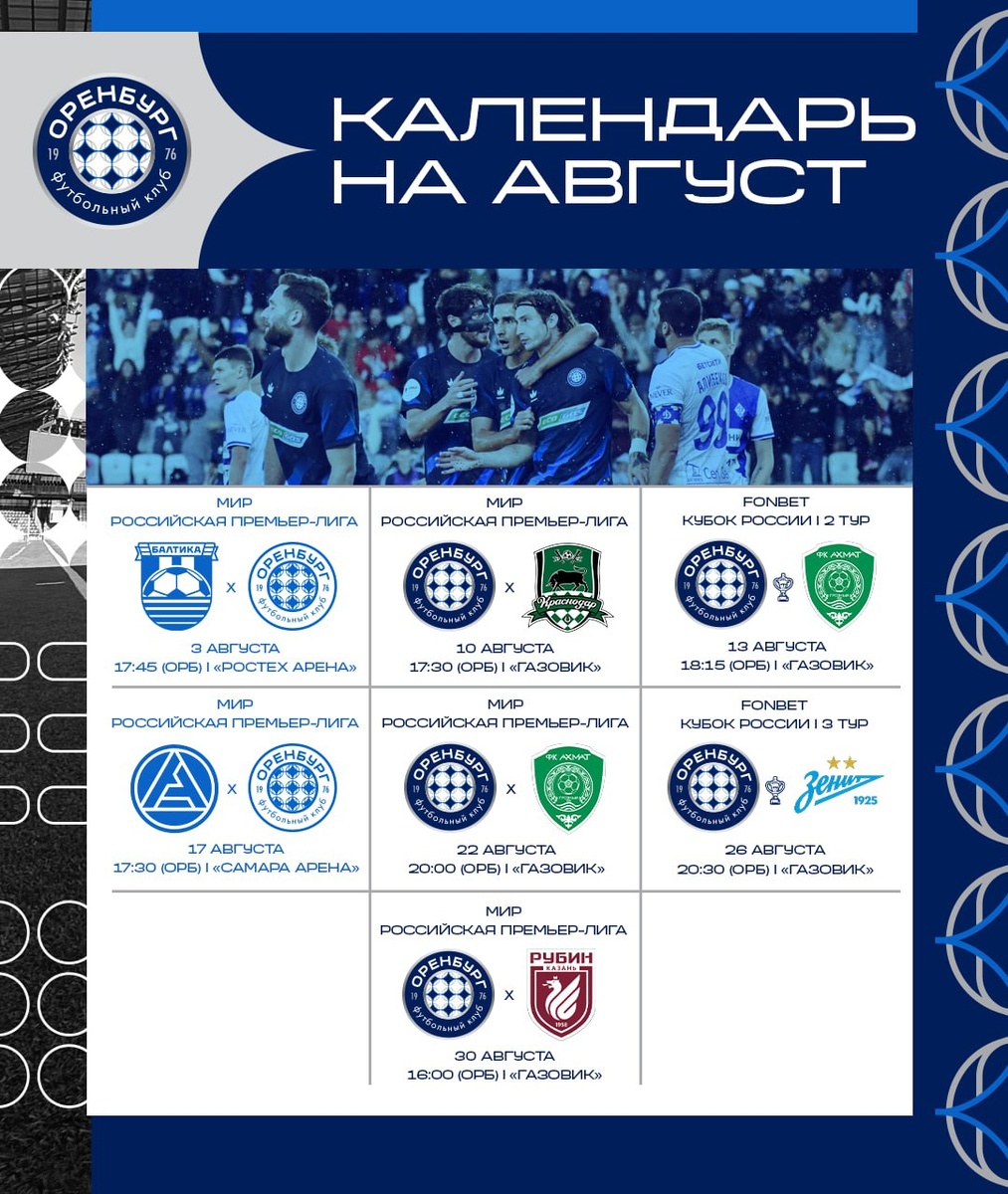 Календарь на август 📆 Врываемся в футбольный август уже завтра с матча против «Балтики». Сохраняем полное расписание и готовимся к домашним встречам 😉 #ФКОренбург