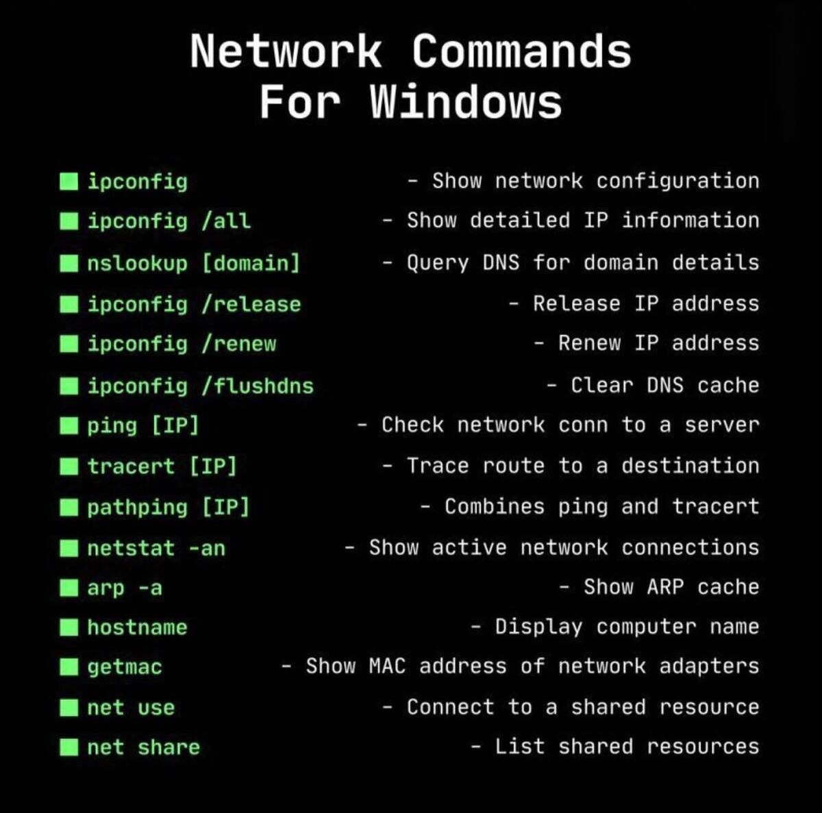 Например, ipconfig показывает текущую сетевую конфигурацию, а ping помогает проверить соединение с сервером. На картинке — 15 базовых команд, которые пригодятся для диагностики и настройки сети в Windows. Сохрани, чтобы не забыть!