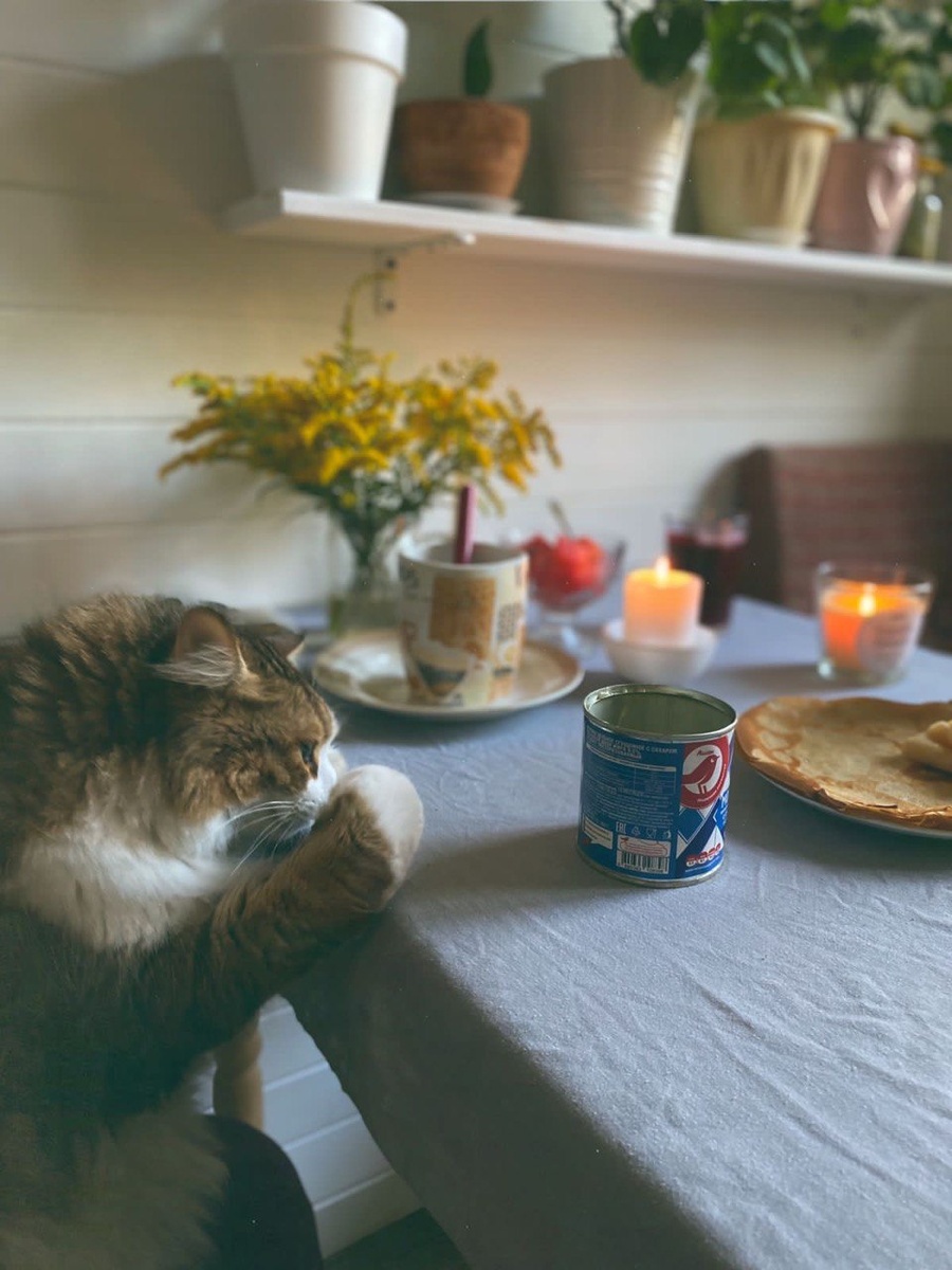 Наглая морда смогла распознать по шелесту пакета колбасу. Муж на кухне стряпал бутерброды и кот посчитал, что не может такого быть, чтобы они не предназначались ему и побежал напомнить о себе.