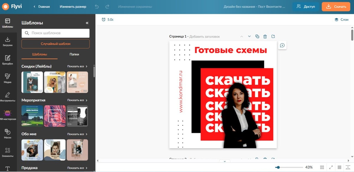 Сохраняйте и делитесь с друзьями! Flyvi - это российский сервис для легкого и быстрого создания фото- и видеоконтента. Специально для упрощения работы созданы шаблоны под каждую известную соцсеть с соответствующими размерами! 1. Зарегистрируйтесь по этой ССЫЛКЕ 2. Есть бесплатный и платные тарифы (рекомендую тариф PRO) - В правом верхнем углу нажмите “Создать дизайн”. - Выберите нужную Вам соцсеть (квадратный 1080х1080 - универсальный формат для всех соцсетей, идеально подходит для оформления фото к посту). - Выберите шаблон. - Загрузите свое фото - см. левую панель Загрузки (при необходимости). - Откорректируйте текст на фото (при необходимости), просто нажав на него. ✅В этой статье расписаны основные функции и лайфхаки P.S. На фото видите дизайн для рекламы готовых схем - они здесь и здесь Ольга Кондакова