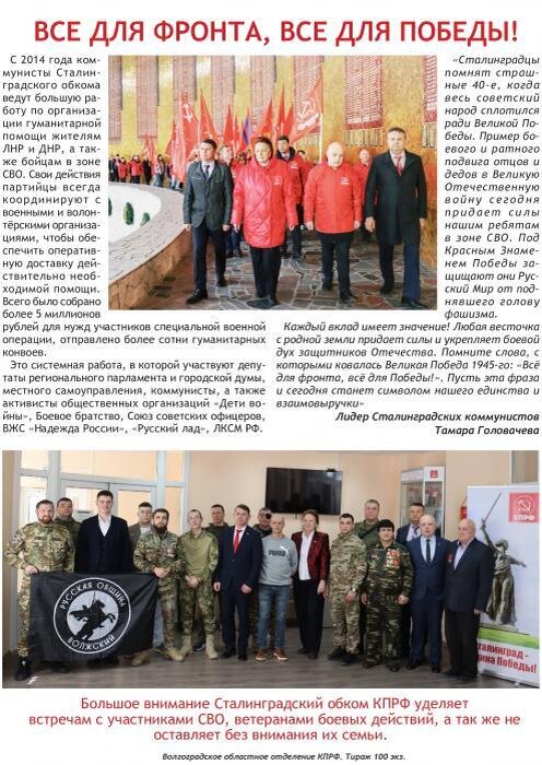 Выполняя решение IV Пленума Волгоградского областного комитета КПРФ, коммунисты дали старт Сталинградскому гуманитарному конвою, посвященному 80-летию окончания Второй мировой войны и капитуляции милитаристской Японии. С 2014 года коммунисты Сталинградского обкома ведут большую работу по организации гуманитарной помощи жителям ЛНР и ДНР, а также бойцам в зоне СВО. Свои действия партийцы всегда координируют с военными и волонтёрскими организациями, чтобы обеспечить оперативную доставку действительно необходимой помощи. Всего было собрано более 5 миллионов рублей для нужд участников специальной военной операции, отправлено более сотни гуманитарных конвоев. И в этот раз гуманитарный груз формируется в соответствии с потребностями военных подразделений. Наши ребята находятся в стадии активных наступательных боевых действий, техника работает в полную силу и выходит из строя. В газете «Сталинградская трибуна» №26 опубликован полный список всего необходимого для тех, кто находится на передово