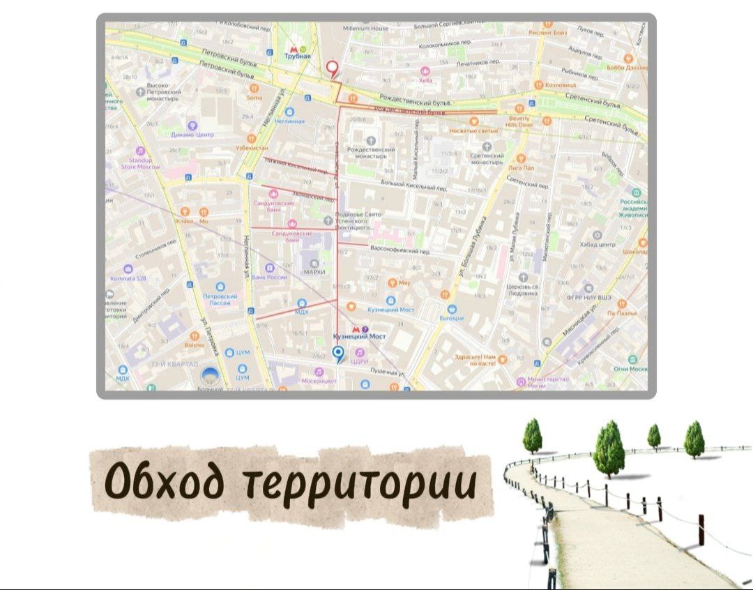 Планируем пройти по Рождественскому бульвару, улице Рождественка, нижнему Кисельному, Звонарскому и Сандуновскому переулкам, а также улице Кузнецкий мост.