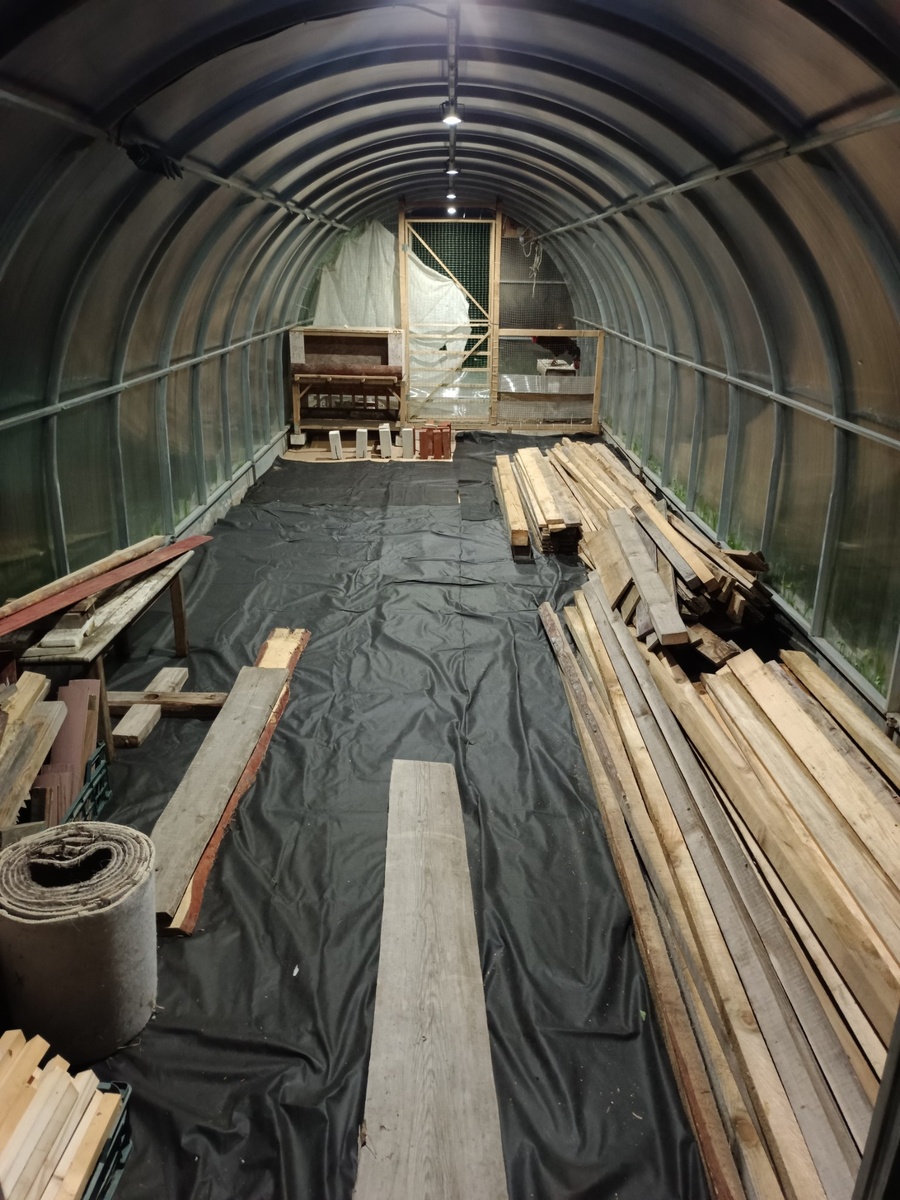 Вначале сюда был перенесён весь короткий материал. Что стоял под крышей патио, да на веранде и вокруг Садового домика. Пусть не мокнет. Вразброс закинут был, после уж сортировал.