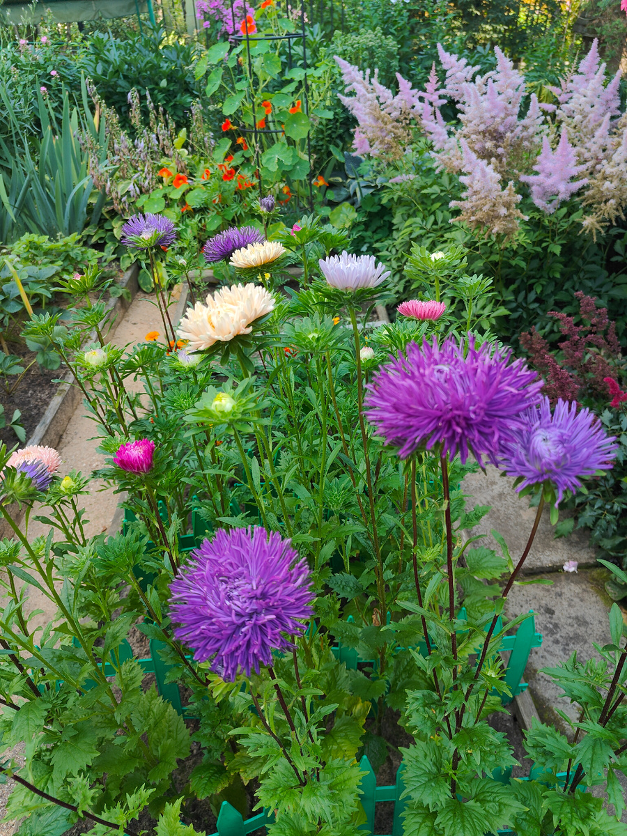 Первый раз решила посадить в этом году астры не точечно в разные цветники, а все вместе просто на грядку. И вот к началу августа они зацвели. Давным-давно, в детстве, так сажали астры в деревне, где жила моя бабушка. Я там проводила все школьные каникулы. У нас цветов не было никаких, и я любовалась на соседские. Больше других меня привлекали бархатцы и астры. И тех, и других высаживали по несколько сортов. А я подолгу разглядывала все возможные вариации цвета. С тех пор астры - одни из моих любимых цветов. Когда у нас уже появилась своя дача, я обратила внимание, что через участок от нас тоже выращивали астры отдельно от остальных цветников, плотной куртинкой. Вспомнилось детство и любимые астры. А в прошлом году в одном из традиционных путешествий по окрестным СНТ мне встретилась просто волшебная картина: весь палисадник был засажен только астрами. И они цвели ковром! И вот тогда я точно решила, что в следующем году точно посажу астры именно так - все вместе, кучно. Выращиваю я ас