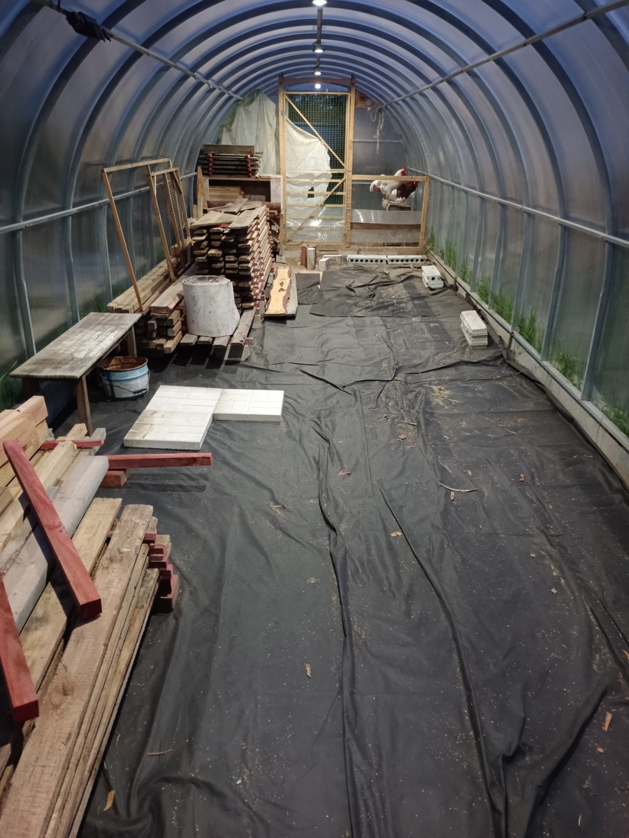 Вдоль одной стены идут коротыши, доски 2 да 3 сорта. Каждая кучка отдельно. Между досками реки прокладки. Для вентиляции.
