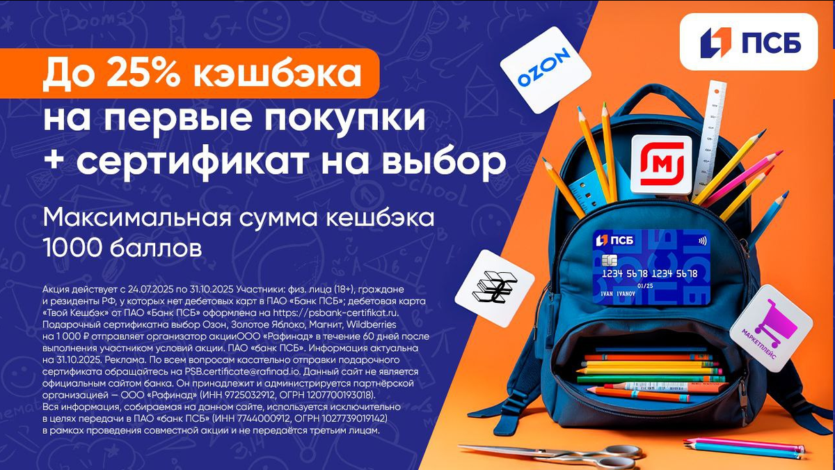 ⚡️Увеличен выбор сертификатов (до 5 шт) за бесплатную дебетовку "Твой Кэшбэк" от ПСБ: 👉Если оформить карту по акционной ссылке до 31 октября и совершить покупку на 1000 руб в первые 3 месяца, подарят 1000 руб на выбор в Озон, Золотое Яблоко, Магнит, Wildberries. * Сертификат придёт в течение 60 дней в смс на указанный номер телефона, для связи: PSB.certificate@rafinad.io. ⭐️ Акция суммируется с кэшбэком 25% (макс 1000б) на все покупки в течение 30 дней с даты получения карты. ✅ Бесплатный выпуск и обслуживание ✅ Кэшбэк по программе лояльности при тратах от 5к/мес ✅ Лимит 3000б/мес ✅ Перевод в рубли от 500б, 1б=1₽ ✅ До 5% в 3-х категориях + 1% на все или 1.5% на все ☝️ С перерывом в 90 дней доступен накопительный счет «Про запас» с фиксированной ставкой 20% на 2 месяца на минимальный остаток до 10 млн. рублей. 💡 До открытия НС можно открыть вклад «Народный» под 30% до 50 тыс. рублей.