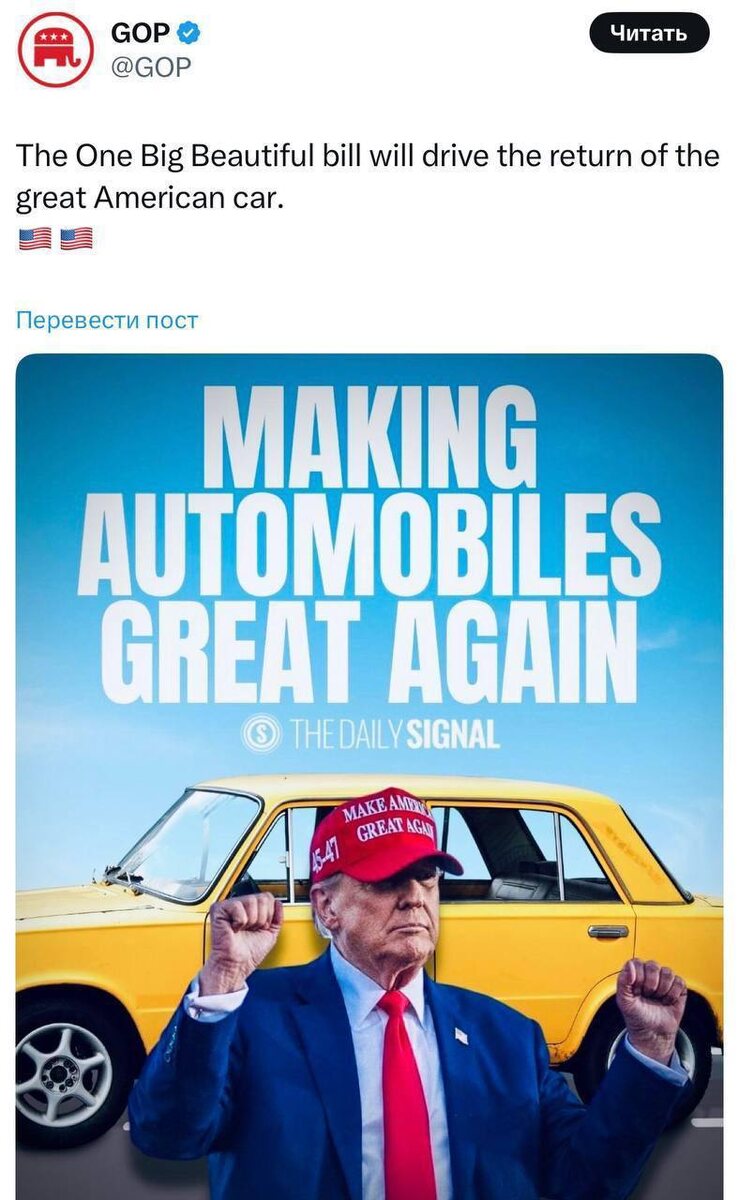Республиканцы опубликовали фото Трампа на фоне ВАЗ 2101 с подписью «возвращение великого американского автомобиля». Республиканская партия анонсировала закон, призванный «возродить великие американские автомобили», сопроводив сообщение об этом фотографией с российской машиной. «Большой красивый законопроект будет способствовать возвращению великого американского автомобиля», — говорится в посте.