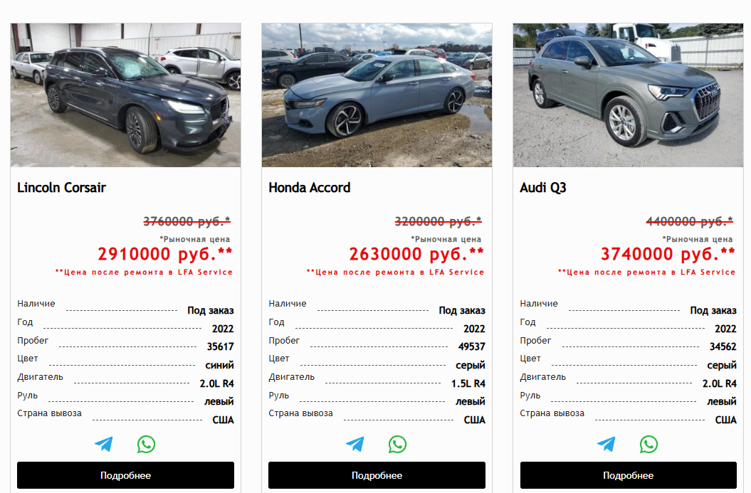 Хотите узнать, сколько будет стоить ваша машина из США? Напишите нам в Telegram или WhatsApp— сделаем расчёт и покажем, как это работает. Еще интереснее - заполнить простую форму и получить скидку в 40000 рублей на авто из США.