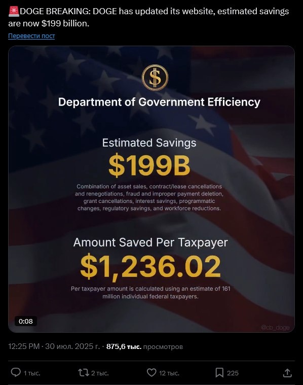 "DOGE обновили свой веб-сайт. Сообщается, что за время работы предположительно удалось сэкономить около 199 миллиардов долларов" 🤑
