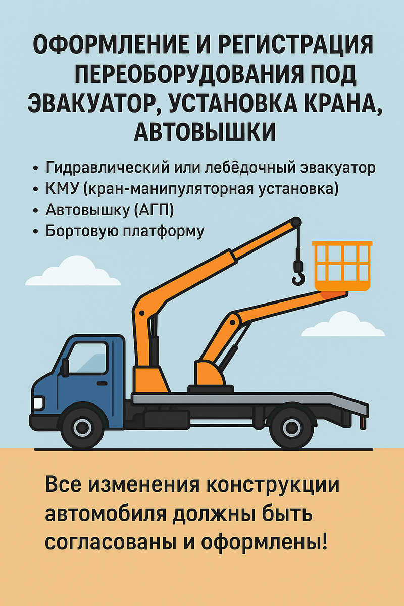 🚧 Переоборудование под эвакуатор, кран или автовышку — это не просто установка оборудования, это серьёзное изменение конструкции, которое требует официальной регистрации! 📑🔧 📦 Хочешь сделать из обычной «газели» мощный эвакуатор или установить кран-манипулятор? Помни: 👉 Все изменения конструкции автомобиля должны быть согласованы и оформлены! 🛠️ Что можно установить: • Гидравлический или лебёдочный эвакуатор • КМУ (кран-манипуляторная установка) • Автовышку (АГП) • Бортовую платформу или лафет • Дополнительные опоры, насосы, гидравлику и т.д. 📑 Как проходит оформление: Получение технического заключения Переоборудование на сертифицированной базе Экспертиза изменений конструкции Регистрация изменений в ГИБДД и внесение в ПТС/СТС 🚓 Всё законно — никаких штрафов, отказов в техосмотре или проблем с продажей! ⚠️ Самовольное переоборудование = штраф до 50 000 ₽ и запрет эксплуатации ТС. Не рискуй техникой и бизнесом — обратись к профессионалам! 📩 Пиши в личку — рассчитаем срок