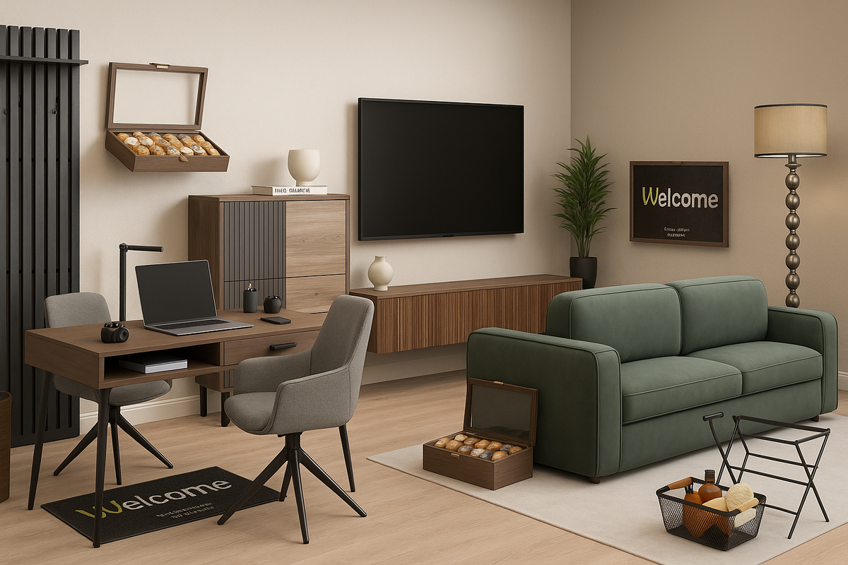 Дружелюбный текст и сдержанная гамма. Визуально приветствует гостей и задаёт атмосферу дома.