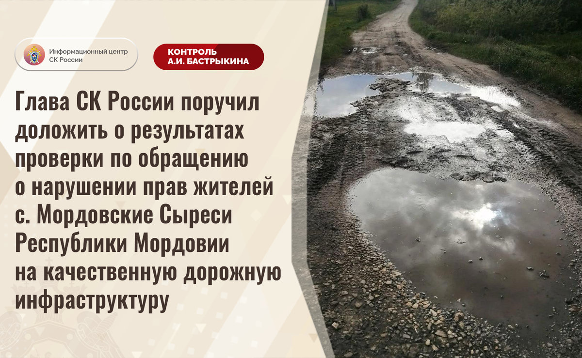 Глава СК России поручил доложить о результатах проверки по обращению о нарушении прав жителей с. Мордовские Сыреси Республики Мордовии на качественную дорожную инфраструктуру В Информационный центр СК России поступило обращение по вопросу нарушения прав жителей села Мордовские Сыреси Республики Мордовии на качественную дорожную инфраструктуру. Более 40 лет ремонт автодороги, соединяющей населенный пункт с райцентром, не проводился, в результате чего она находится в непригодном состоянии: асфальтовое покрытие отсутствует, на поверхности образовались многочисленные ямы и колеи, грунтовое полотно при выпадении осадков размывается. В связи с этим проезд автомобилей, в том числе экстренных служб, к домовладениям затруднен. Обращения в различные инстанции результатов не принесли. Ситуация освещалась в социальной сети. В СУ СК России по Республике Мордовии по поступившему обращению организована процессуальная проверка. Председатель Следственного комитета Российской Федерации Александр Иванов