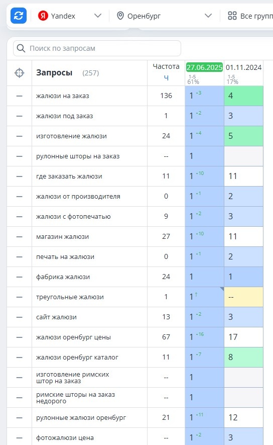 С данным клиентом работаю с ноября 2024, то есть, уже получается более полугода. Очень хороший клиент с хорошим понятным бизнесом. Начали работу с базы: проведение всех возможных аудитов, устранение ошибок, и доработка сайта новыми страницами. Сайт небольшой, с небольшим ассортиментом, на платформе МОД-Х. Продвижение сайта по городу Оренбургу и области. Но кстати есть в планах работа на Москву, так как иногда приходят заявки с столицы. Это глюк Яндекса, иногда поисковая система путает регион. Далее, сразу подключили ссылки и ПФ. Самые эффективные способы продвижения сейчас в Яндекс и Гугл. С клиентом и сейчас продолжаем работу, но за полгода уже результаты вот такие. Очень хорошие и стабильные. Рост запросов более чем в 3.5 раза по топ-10. Клиент сам работает с Яндекс Директом, поэтому сайт занимает первые места и в сео и в рекламе. То есть, в топ-10 у нас по сути, 2 сайта, а не 1. Запросов крутится немного, но они все важные с коммерческой точки зрения. Нет мусора среди нет, или